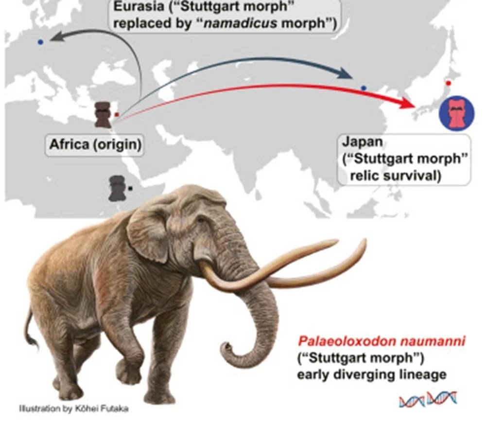 أكدت دراسة وراثية جديدة أن الفيل الياباني يمثل بالفعل سلالة مبكرة. يعتقد العلماء أن جنس Palaeoloxodon نشأ في أفريقيا وبدأ بالهجرة إلى أوراسيا منذ حوالي 0.78 مليون سنة. واحدة من المجموعات السكانية الأولى، التي تمتلك سمات بدائية، انتشرت بسرعة شرقًا، وصولاً إلى شرق آسيا.