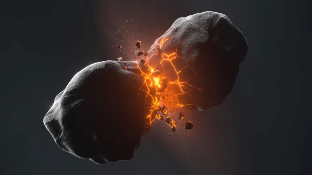 في بداية حياة النظام النجمي، يمكن أن يكون الفضاء منطقة تحطم فوضوية. كثيرًا ما تتصادم قطع الصخور والجليد، مثل المذنبات والكويكبات، وتتفكك أحيانًا وتلتصق معًا أحيانًا. وبمرور الوقت، يساعد هذا التدافع المستمر على تحويل الغبار الأصلي والمواد المتجمدة في السديم النجمي إلى كواكب وأقمار. يُعتقد أن أكبر التصادمات غير شائعة على مدار مئات الملايين من السنين التي يستغرقها بناء نظام كوكبي كامل، حيث تحدث مرة واحدة فقط كل 100000 عام.
