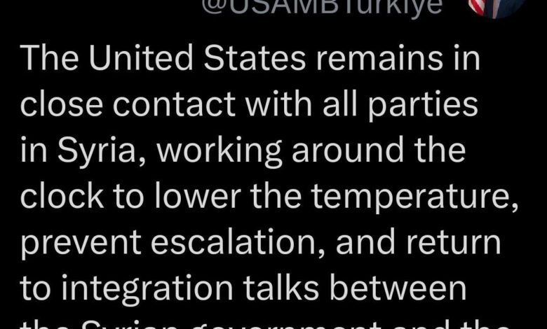 كتب المبعوث الأمريكي في حسابه على منصة “إكس”: “تحافظ الولايات المتحدة على اتصالات وثيقة مع جميع الأطراف في سوريا وتعمل على مدار الساعة لتهدئة الأوضاع ومنع التصعيد والعودة إلى محادثات الدمج بين الحكومة السورية وقوات سوريا الديمقراطية”.